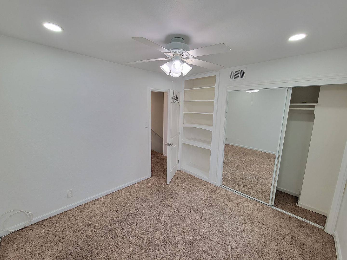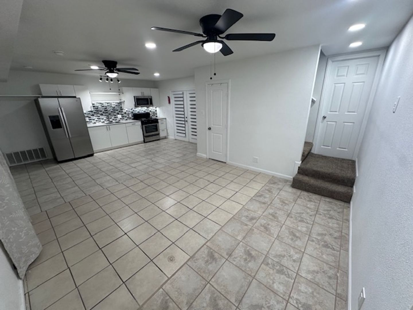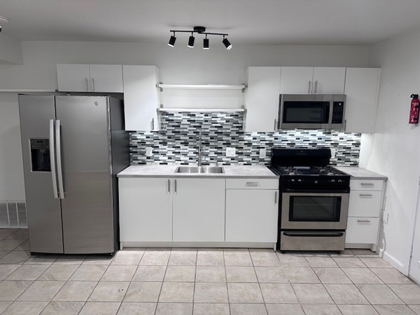 New Appliances: A sleek, white kitchen with brand-new fridge, stove, range hood, and microwave for a fresh, modern look.